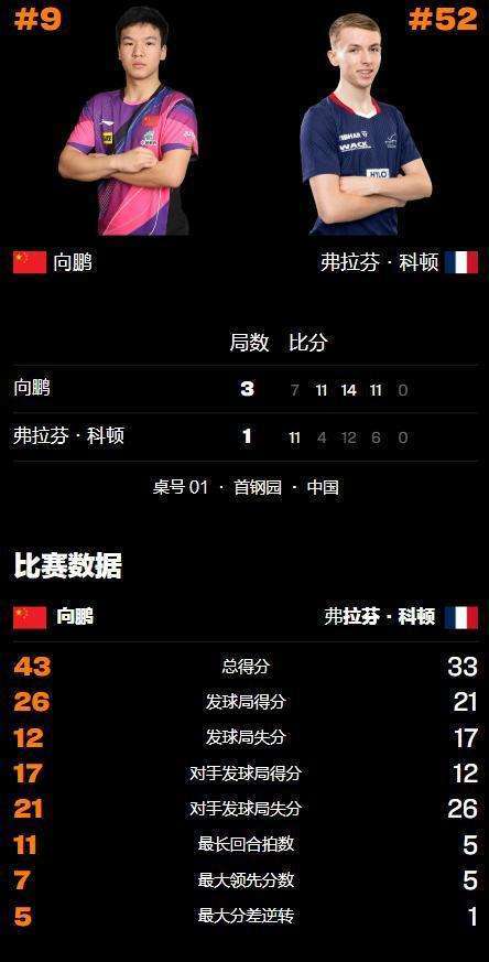 比赛开始后,科顿展现了不畏强敌的勇气。他的发球和抢攻十分坚决,单板质量也很高,迅速以3-0取得领先。虽然向鹏逐渐找到了感觉,追平了比分,但科顿依然保持了积极进攻的态度,最终以11-7拿下了首局,领先1-0。