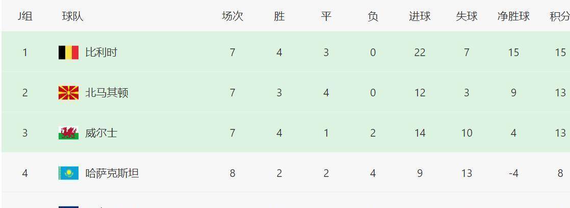 此役过后,比利时积15分,仅领先同组的北马其顿2分。 由于未能战胜小组垫底的哈萨克斯坦,他们错失了提前一轮晋级世界杯的机会。