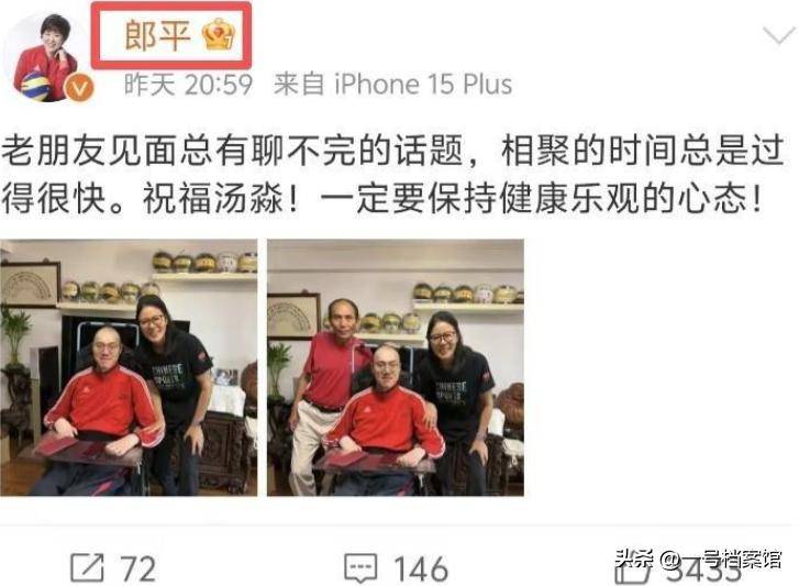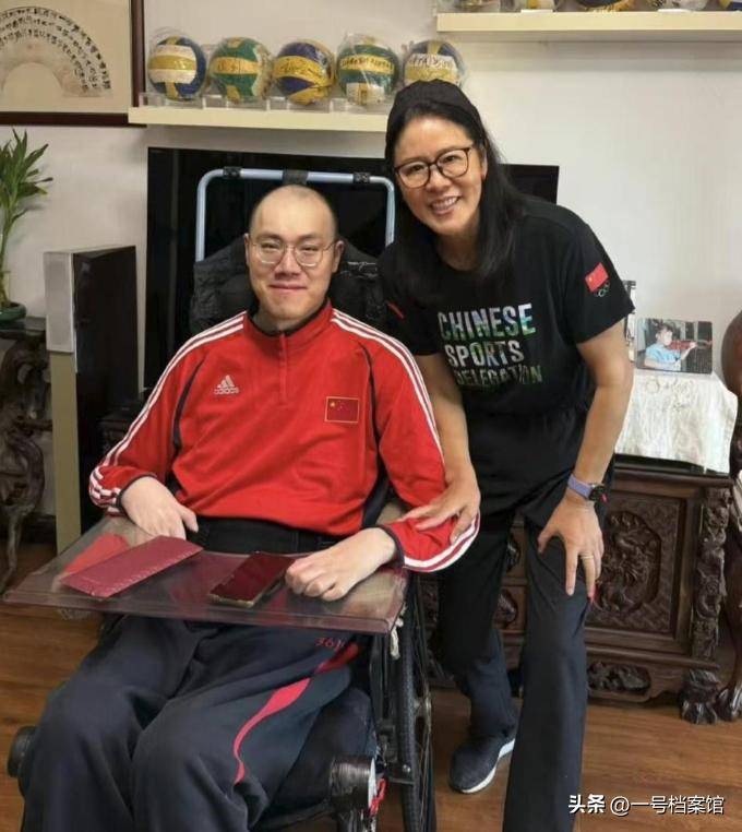 从照片里看到她和唐淼的合照,唐淼当年在热身运动中受了伤,被迫选择退役,如今的他坐在轮椅上,郎平在旁边一腿向前弯腰和他拍照。