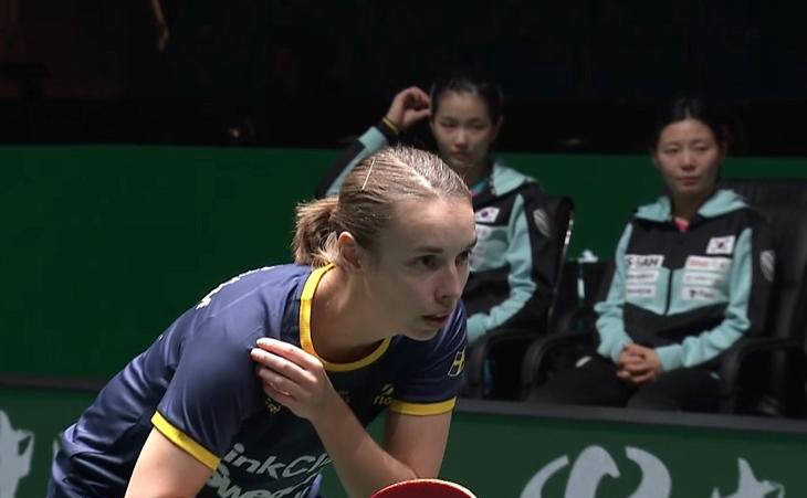 接下来,韩国选手申裕斌迎战瑞典削球手琳达·博格斯特隆。虽然世界排名和实力上申裕斌占优,但博格斯特隆毫不示弱,施加了不少压力。首局她凭借出色发挥以12比10险胜。第二局中申裕斌表现强势,从1比6落后紧咬比分,最终以12比10扳回。决胜局两人交替得分,申裕斌以11比5笑到最后,使韩国队领先4比2。